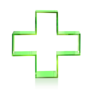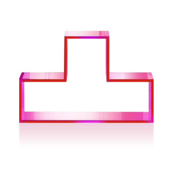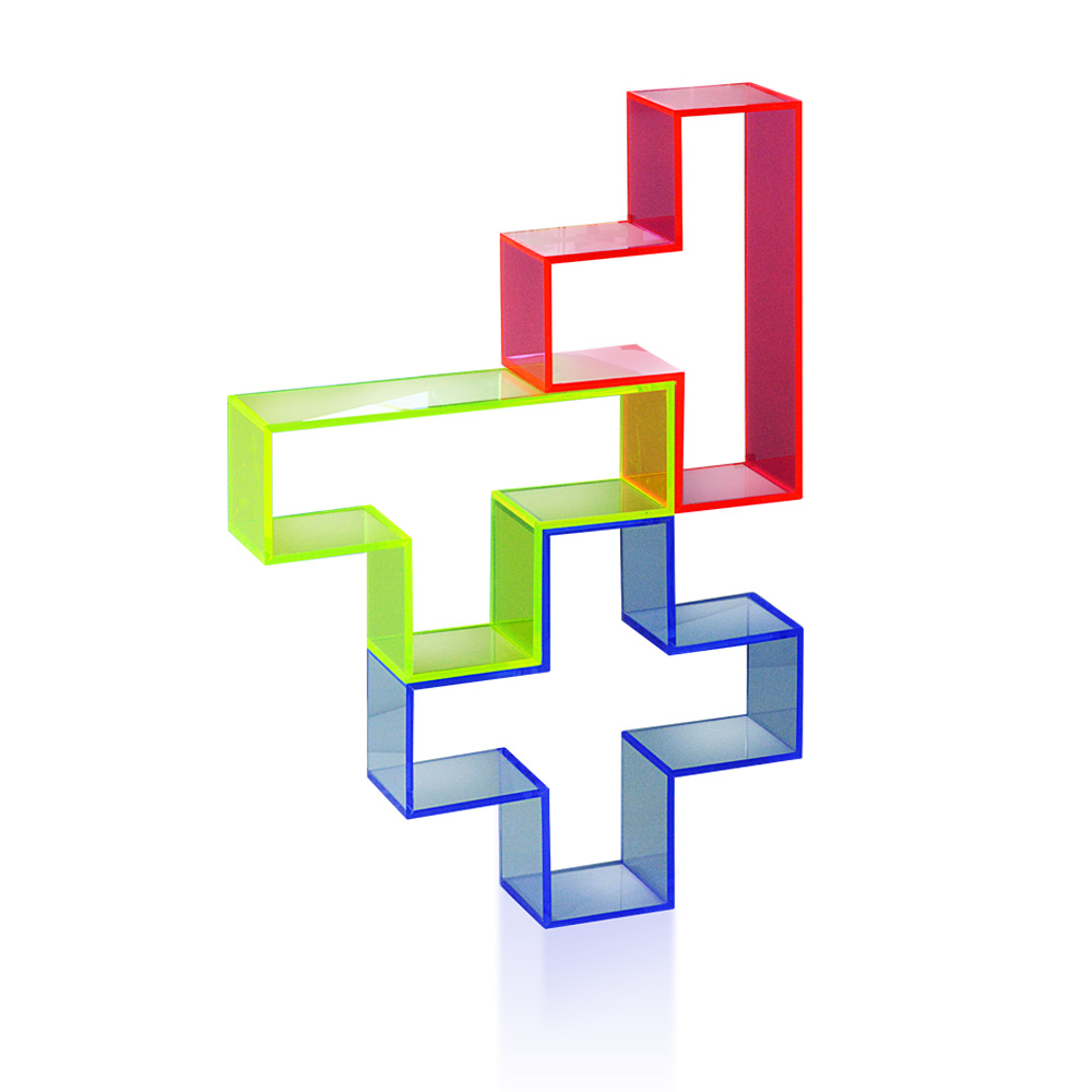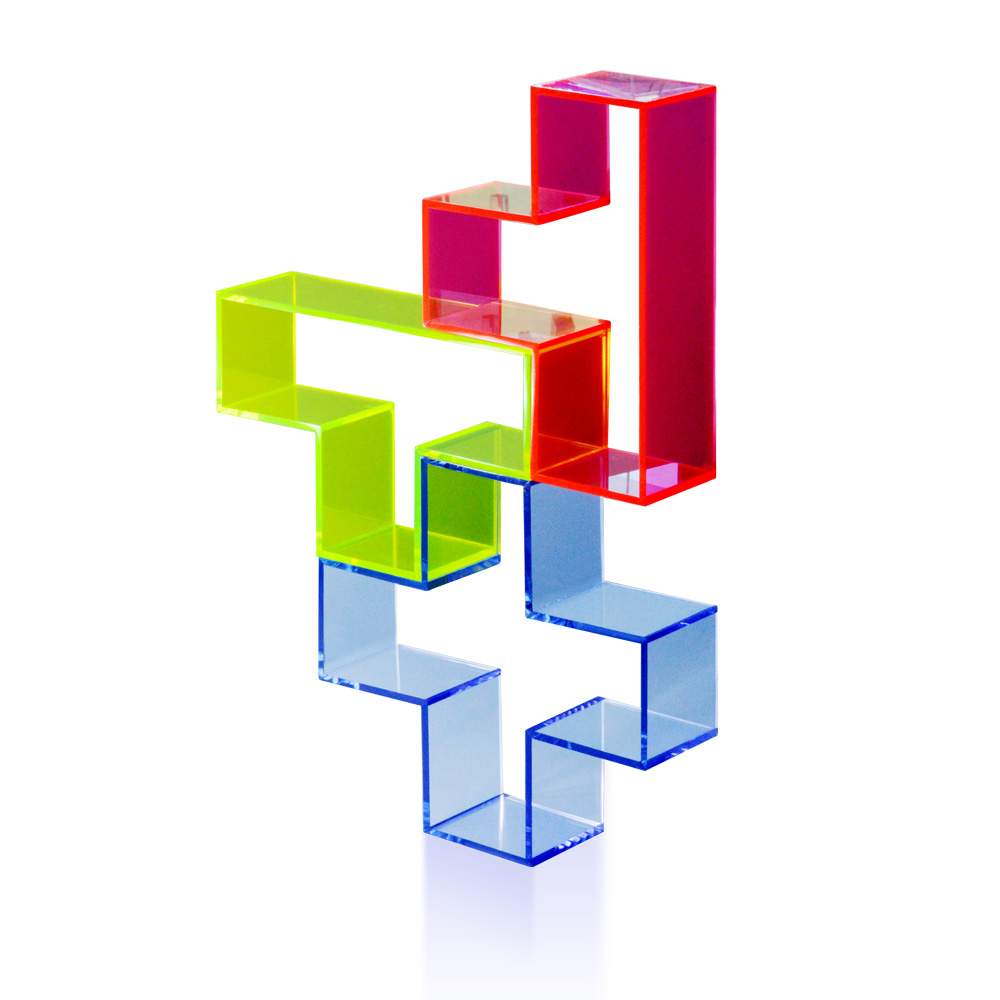 Accessorio vetrina realizzato in plexiglas fluo, utile alla creazione di effetti scenici. Accostato agli altri componenti di colore differente simula il noto video game.